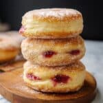 - Fill the Donuts: Insert the piping bag tip into the center of each donut and gently squeeze to fill with raspberry jelly, allowing the jam to ooze inside.