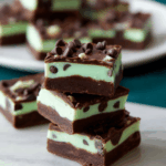 Keywords: Andes mint fudge, mint chocolate chip fudge, layered fudge recipe, easy fudge, holiday fudge, chocolate peppermint fudge