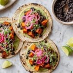 These Avocado Sweet Potato Tacos combine the natural sweetness of roasted sweet potatoes with creamy avocado yogurt sauce and hearty black beans, wrapped perfectly in warm tortillas. Topped with fresh scallions, crumbled cheese, pickled onions, and microgreens, this vibrant recipe offers a delicious and nutritious twist on traditional tacos, perfect for a vegetarian meal that’s bursting with flavor.