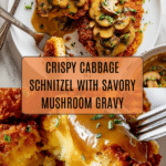 Keywords: Cabbage schnitzel, vegetarian schnitzel, mushroom gravy, crispy cabbage cutlets, fried schnitzel, comfort food, vegetarian main dish