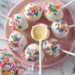 Delicious and fun vanilla cake pops made from scratch using a boxed cake mix, creamy frosting, and coated with smooth candy melts. Perfectly bite-sized and decorated with optional sprinkles, these cake pops are a delightful treat for parties or any occasion.