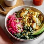 Delicious and nutritious Cauliflower Chickpea Potato Bowls featuring roasted Yukon Gold potatoes, spiced cauliflower and chickpeas, fresh kale, grated beets, pickled red onions, creamy avocado, and a tangy tahini dressing. This wholesome bowl offers a perfect balance of flavors and textures, ideal for a satisfying vegetarian meal.