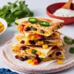 This classic Quesadilla recipe features a delightful combination of sharp cheddar and Monterey Jack cheeses, complemented by black beans, red bell pepper, scallions, corn, and jalapeños all folded inside warm flour tortillas. Perfectly cooked in a cast iron skillet until golden and melty, these quesadillas are served with your choice of salsa, pico de gallo, guacamole, sour cream, and fresh cilantro for a flavorful and satisfying meal or snack.
