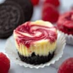 Keywords: cheesecake bites, mini cheesecakes, Oreo crust, raspberry swirl, party dessert, creamy cheesecake, bite-sized cheesecakes
