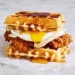 This Chicken & Waffle Breakfast Sandwich combines crispy fried chicken thighs marinated in a spicy buttermilk blend, topped with a perfectly cooked runny egg, sandwiched between golden toasted waffles, and finished with a sweet and spicy hot honey drizzle. A delicious balance of crunchy, savory, sweet, and spicy elements perfect for brunch or a hearty breakfast.