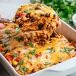 - Garnish and Serve: Optionally, sprinkle chopped cilantro on top for a fresh finish before serving. Enjoy your warm, cheesy Chicken Burrito Casserole!