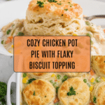 Keywords: Chicken pot pie, chicken casserole, biscuits, comfort food, savory pie, homemade biscuits, chicken and vegetable pot pie
