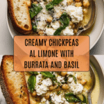 Chickpeas al Limone with Burrata is a bright and creamy Italian-inspired dish featuring tender chickpeas cooked in a lemony, Parmesan-infused sauce, topped with fresh burrata cheese and basil leaves. Served warm with crusty sourdough or baguette, this comforting and elegant recipe balances zesty citrus flavors with rich, creamy textures, making it perfect as a light lunch or appetizer.