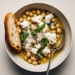 - Plate and garnish: Divide the chickpeas among serving bowls. Drizzle with extra olive oil. Tear the burrata over the top and scatter fresh basil leaves and additional Parmesan cheese. Serve immediately alongside slices of sourdough or baguette for dipping.