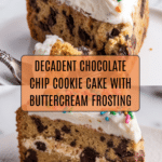 Keywords: chocolate chip cookie cake, chocolate chip cookie, cookie cake recipe, dessert cake, buttercream frosting, celebration dessert