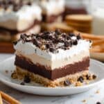 Keywords: Chocolate Peanut Butter Lasagna, no bake dessert, peanut butter dessert, layered dessert, Nutter Butter crust, chocolate pudding, easy dessert