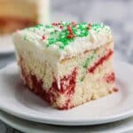 - Garnish: Finish the cake by sprinkling crushed peppermint candies and red and green sprinkles over the top for a festive holiday touch.