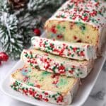 Keywords: Christmas bread, holiday bread, festive bread, sprinkle loaf, vanilla glaze, cinnamon bread, Christmas dessert
