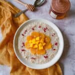 Keywords: Coconut rice pudding, mango dessert, honey sweetened pudding, tropical rice pudding, creamy rice pudding, coconut milk dessert