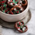 Store leftover chocolate-covered pretzels in an airtight container at room temperature. They will keep fresh for up to one week. If your home is warm, refrigeration is fine but allow pretzels to come back to room temperature before enjoying for the best texture.