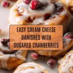 Delightfully flaky and tender Cream Cheese Danishes topped with homemade sugared cranberries and a luscious vanilla butter glaze. These danishes combine the tangy cream cheese filling with sweet jam and the crunch of tart cranberries for a perfect breakfast or dessert treat.
