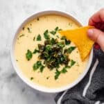- Serve: Transfer the queso blanco to a serving dish or slow cooker. Top with the remaining diced peppers and chopped cilantro or other garnishes. Keep warm and serve immediately with chips, vegetables, or your favorite dishes.