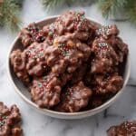 - Add sprinkles: Immediately sprinkle holiday sprinkles over each cluster while the chocolate is still wet so the sprinkles adhere well.