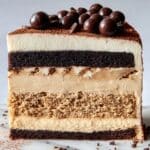 - Garnish and serve: Place a sheet of parchment paper diagonally across the top of the cake, gently pressing it into the frosting to adhere. Using a fine-mesh sieve, dust one exposed half of the cake with unsweetened cocoa powder. Carefully remove the parchment sheet to reveal a clean line dividing the dusted and nondusted sides. Decorate the undecorated half with chocolate-covered espresso beans for an elegant finish. Serve chilled for a rich, coffee-spiked dessert experience.