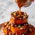 This recipe features fondant slow-roasted sweet potatoes, cooked to tender perfection and served with a luscious maple butter pecan sauce. The sweet potatoes are sliced thickly, roasted with butter and olive oil, then slow-cooked in chicken stock to absorb rich flavors. The dish is topped with a warm, spiced maple butter sauce studded with toasted pecans and fresh thyme, making it an elegant side dish perfect for holiday meals or comforting dinners.