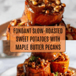 Keywords: fondant sweet potatoes, slow roasted sweet potatoes, maple butter pecans, roasted sweet potato recipe, holiday side dish, autumn recipes, pecan sauce