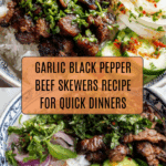 These Garlic and Black Pepper Beef Skewers are a flavorful and quick-to-make dish featuring marinated skirt steak strips broiled to perfection with a caramelized crust. Enhanced with garlic, ginger, curry powder, and freshly cracked black pepper, these skewers are perfect for a casual meal served with rice and a fresh vegetable side like cucumber salad or broccoli.
