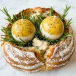 - Insert Candles into Bread: Place each butter candle into its respective hole in the bread. Fill any gaps around the candles with rosemary sprigs for decoration and to hold the candles steady. Trim the wick length if it appears too long.