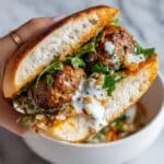 - Assemble the Sandos: Warm the bread to make it soft and pliable. Spread mayo or kewpie generously on the bread. Layer on the cooked meatballs, followed by sliced cucumber, shallots, fresh cilantro, mint leaves, and finish with a drizzle of chili crisp or sriracha for a spicy kick. Serve immediately to enjoy the messy, saucy goodness.