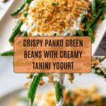 - Assemble the Dish: Spread the seasoned green beans on a serving plate. Pour the whipped tahini yogurt sauce evenly over the beans, then generously pile the toasted panko topping on top. Serve immediately and enjoy!