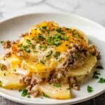 Hobo Casserole is a comforting, hearty baked dish featuring layers of thinly sliced russet potatoes, savory ground beef, and a creamy, flavorful sauce made with butter, onions, cream, sour cream, and diced green chiles. Topped with melted cheddar cheese, this casserole is perfect for a cozy family dinner.