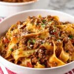 This classic Homemade Bolognese Sauce is a rich and hearty Italian meat sauce made with ground beef and pork, simmered slowly with vegetables, red wine, milk, and tomatoes to develop deep, layered flavors. Served with pappardelle or your favorite long pasta, it’s a comforting and satisfying meal perfect for any occasion.