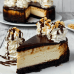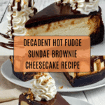 The Hot Fudge Sundae Brownie Cheesecake is a decadent dessert that combines rich brownie, creamy cheesecake, and luscious chocolate ganache. Topped with fluffy whipped cream and crunchy peanuts, it’s a delightful treat perfect for special occasions or any time you crave something indulgent.