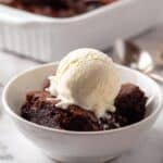 Keywords: brownie pudding, Ina Garten recipe, chocolate dessert, water bath brownie, fudgy pudding, warm dessert, vanilla ice cream topping
