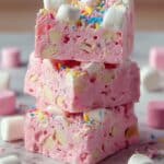 This Irresistible Bubblegum Cloud Fudge is a fluffy, sweet treat that evokes nostalgic childhood memories with its creamy white chocolate base infused with bubblegum flavor and swirled with pastel colors. Soft mini marshmallows add a delightful chewiness, while vibrant confetti sprinkles bring a festive pop to each bite. Perfectly rich yet playful, this no-bake fudge is a fun twist on classic sweets.