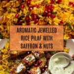Keywords: Jewelled rice pilaf, saffron rice, basmati rice recipe, Middle Eastern rice, festive rice side dish, pilaf with dried fruit and nuts, vegetarian pilaf
