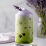 A refreshing and delicate Lavender Cream Iced Matcha Latte made with smooth vanilla oat milk, vibrant matcha powder, and topped with a floral-scented lavender cream cold foam for a uniquely delightful iced beverage perfect for any time of day.