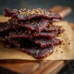 Lemon Pepper Beef Jerky is a flavorful, tangy, and peppery snack made from lean beef marinated in a zesty lemon and cracked black pepper mixture, then slowly dried to perfection. This homemade jerky is tender yet chewy with a bright citrus kick and bold pepper spice, perfect for a high-protein snack on the go.