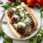 This hearty Meatball Sandwich recipe features flavorful beef meatballs cooked to perfection and smothered in a rich homemade marinara sauce, layered with melted mozzarella and cheddar cheeses inside a warm, crusty baguette. Topped with grated parmesan and fresh parsley, this sandwich makes a delicious and satisfying meal perfect for lunch or dinner.