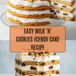 Milk ‘N’ Cookies Icebox Cake is a nostalgic dessert that combines the rich creaminess of whipped cream and cream cheese with the chocolaty crunch of chocolate chip cookies. Easy to assemble and chill, it’s perfect for a no-bake treat that’s sure to delight both kids and adults alike.