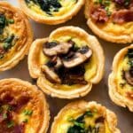 Keywords: mini quiche, quiche lorraine, spinach quiche, mushroom quiche, mediterranean quiche, appetizer, brunch, savory pastry, shortcrust pastry