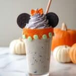 A festive and fun Minnie Witch Shake combines creamy mint chocolate chip ice cream blended with crushed Oreo cookies, topped with vibrant purple whipped cream, decorated with orange candy-coated glass rims and candy bows for a magical Halloween-themed treat.