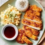 - Serve: Serve the chicken katsu immediately with katsu sauce and preferred side dishes such as steamed Calrose rice and mac salad for a Hawaiian plate lunch experience. Enjoy!