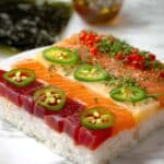 - Arrange Sushi on Platter: Transfer the rice carefully (with the parchment) onto your serving platter. Divide the rice into three sections: top one section with spicy shrimp, one with salmon slices, and one with bluefin tuna slices arranged in neat rows. The spicy shrimp portion will create 6 bites, and each fish variety will make 9.
