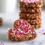 - Shape Cookies: Line a baking sheet with parchment paper or a silicone baking mat. Using a heart-shaped cookie cutter, scoop 2 to 3 tablespoons of the oat mixture into the center of the cutter. Flatten the mixture gently with the back of a spoon, then carefully remove the cookie cutter. Repeat until all the mixture is shaped into cookies. Optionally, add pink sprinkles on top for a festive Valentine’s touch.