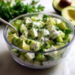 A refreshingly creamy and tangy avocado cucumber salad that combines crisp cucumber chunks, creamy avocado, and a zesty lime-infused mayonnaise dressing. Garnished with fresh herbs and a touch of heat from Sriracha, this salad makes a perfect light side dish or snack.