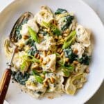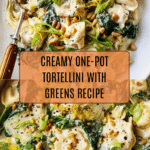 This One-Pot Creamy Tortellini & Greens recipe is a quick and comforting meal featuring spinach and cheese tortellini cooked in a creamy, savory sauce with vibrant greens and artichokes. Enhanced with toasted pine nuts and lemon zest for added texture and brightness, this dish is perfect for a satisfying weeknight dinner with minimal cleanup.