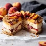 A luscious Peach Cobbler Cheesecake combining the creamy richness of classic cheesecake with sweet roasted peaches and a crunchy cinnamon streusel topping, all resting on a buttery graham cracker crust. This dessert layers roasted peach filling within the cheesecake and finishes with fresh roasted peaches and streusel on top for a perfect balance of textures and flavors.