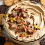- Step 5: Transfer the dip to a serving bowl, decorate the top with your choice of toppings like peanut butter cups, chocolate chips, or Reese’s Pieces, and refrigerate until ready to serve.