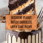 Keywords: Peanut Butter Chocolate Layer Cake, Chocolate Cake, Peanut Butter Frosting, Reese’s Cake, Chocolate Ganache, Layer Cake
