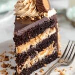 Keywords: Peanut Butter Chocolate Layer Cake, Chocolate Cake, Peanut Butter Frosting, Reese’s Cake, Chocolate Ganache, Layer Cake
